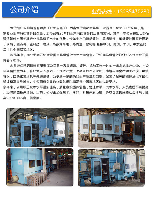 太谷繼紅瑪鋼鑄造有限公司是一家專業(yè)生產(chǎn)瑪鋼管件的企業(yè),至今已有20年的生產(chǎn)瑪鋼管件的歷史與累積。本公司在出口外貿(mào)瑪鋼管件方面尤其專業(yè)并具有相當大的優(yōu)勢,長年生產(chǎn)的德標管件、美標管件、英標管件遠銷俄羅斯,伊朗,墨西哥,孟加拉,埃及,哈薩克斯坦,烏克蘭,智利等.包括歐洲、美洲、非洲、中東亞的二十幾個國家和地區(qū)。